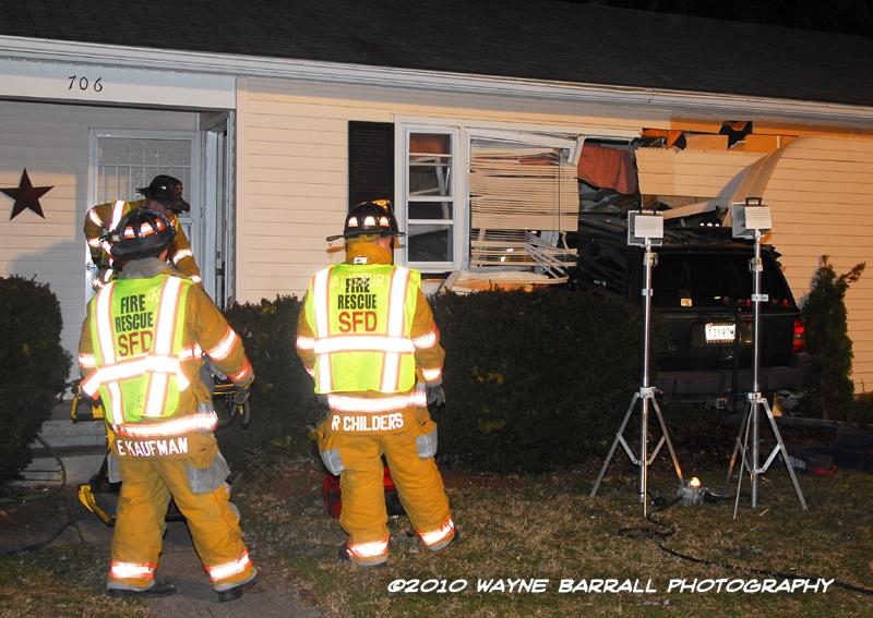 2/28/2010 – On 2-28-10 the Salisbury Fire Departments Stations 2 & 16 were alerted for an accident with rescue at 706 Hammond St. Assistant Chief 1 arrived to find a SUV that had ran a stop sign on Middleneck Dr and collided into the home on Hammond St. The driver of the vehicle was still inside and unable to get on his own.