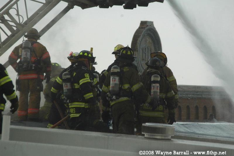 Michal Dixon, a secretary at nearby Grace United Methodist Church, said flames were still visible more than an hour after the first alarm sounded. The church was opened to rescue workers ”to come in and get warm,” said Dixon, who noted snow had fallen earlier.