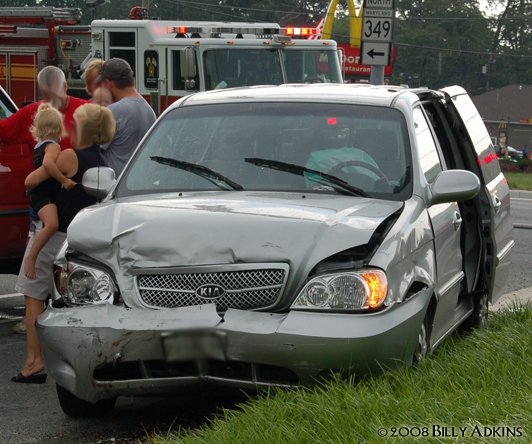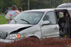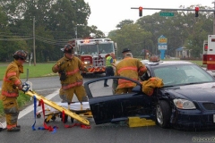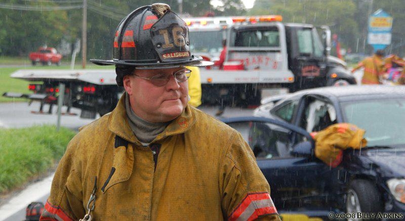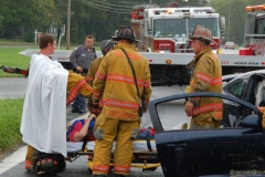 8/2/2008 – At 11:00AM Wicomico County Central alerted Salisbury Stations 16 and 2 for a 2 car MVC with Rescue. Crews arrived to find what appeared to be a t-bone type accident with one person trapped in the passenger seat of a Pontiac G5. Firefighters quickly popped the passenger door to free the trapped patient. Crews worked in the rain and used their own coats to help keep the pateints dry as they moved the patients from the car to the the awaiting ambulances. A total of five priority three patients were transported to PRMC.