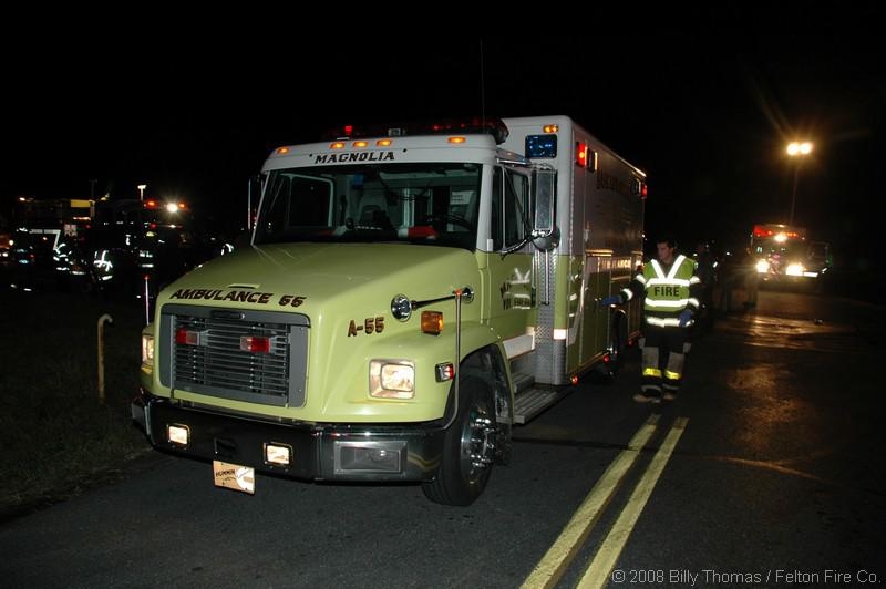 12/20/2008 – On December 20, 2008 at 2125 Kent County E.O.C. alerted Station 55 (Magnolia), Station 48 Rescue Company, Trooper 2, Kent Medics 68 & 65 to the intersection of Autumn Moon Lane & Millchop Lane for a reported MVC with entrapment.