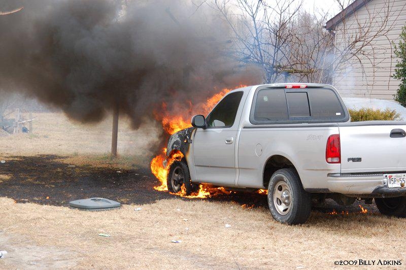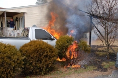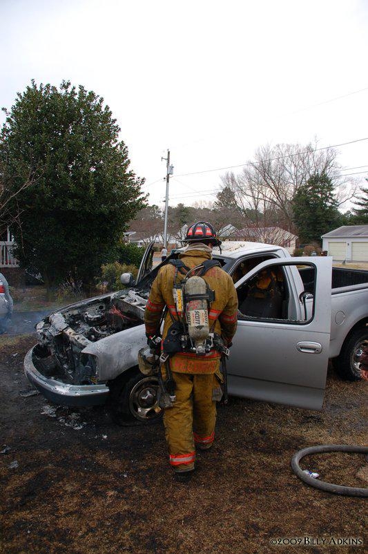 2/10/2009 – At 13:55 Wicomico EOC alerted Station 2 of a vehicle fire on Pine Way. Truck 2 arrived to fine a Ford Truck with the engine compartment fully involved, with the hood already gone (melted or otherwise) with exposure to another vehichle. Crews pulled a 1 1/2” line and quickly knocked down the fire in the vehicle and surrounding area. The heat from the fire damaged a car cover on the neighbors car, and caused some heat damage to the siding on the occupants house. Command requested the Fire Marshal because the actuall cause of the fire was not apparent at that time. The Fire Marshals Office is investigating the cause of the fire.