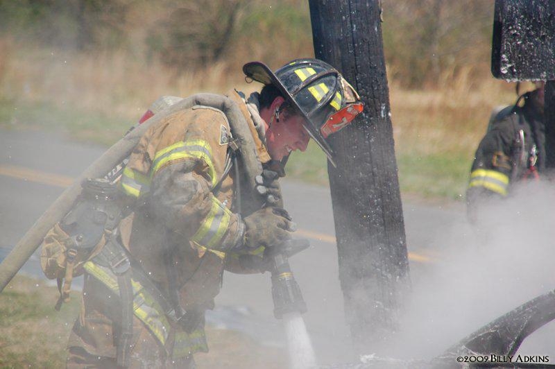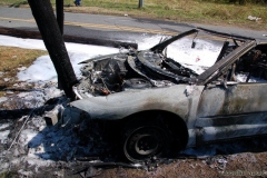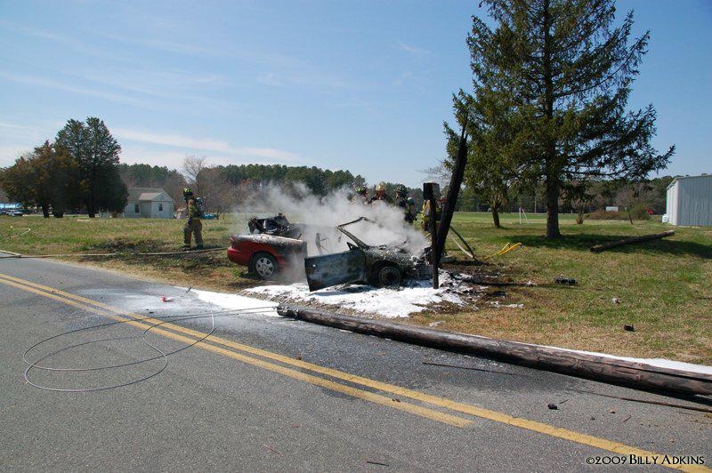 3/31/2009 – The Delmar Fire Department was alerted for a vehicle accident on Old Stage Rd just east of Rt.13. Engine 74-3 arrived to find a Chrysler Sebring fully involved after coming in contact with a utility pole. All four passengers were able to get out of the vehicle with out serious injury. Due to the utility pole breaking half way up and charged power lines on and around the car crews had to wait for the power company to arrive. Upon their arrival responders were able to extinguish the fire. Command requested 3 additional medic units to the scene to transport all four occupants to Peninsula Regional Medical Center in Salisbury Md. Units cleared the scene in about 45 minutes. Delmar Fire Police shut down Old Stage Rd during the alarm.