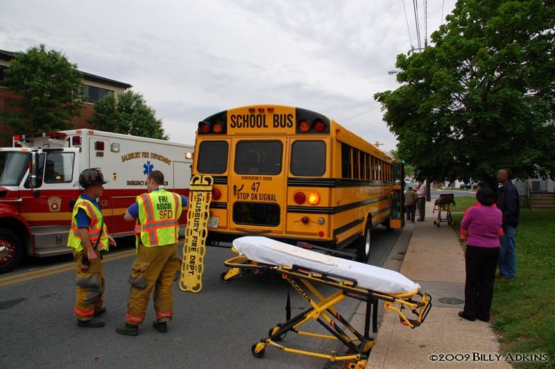 5/18/2009 – SALISBURY, Md.- Authorities say that 17 people- including 14 students from Parkside High School, North Salisbury Elementary School and Bennett Middle School- were taken to the hospital following a Monday morning crash in Salisbury involving a Wicomico County school bus and two other vehicles.
