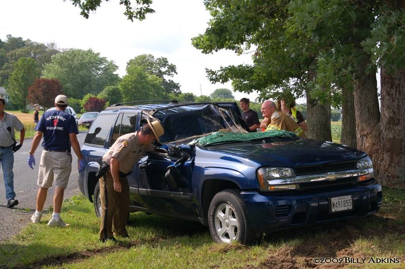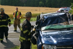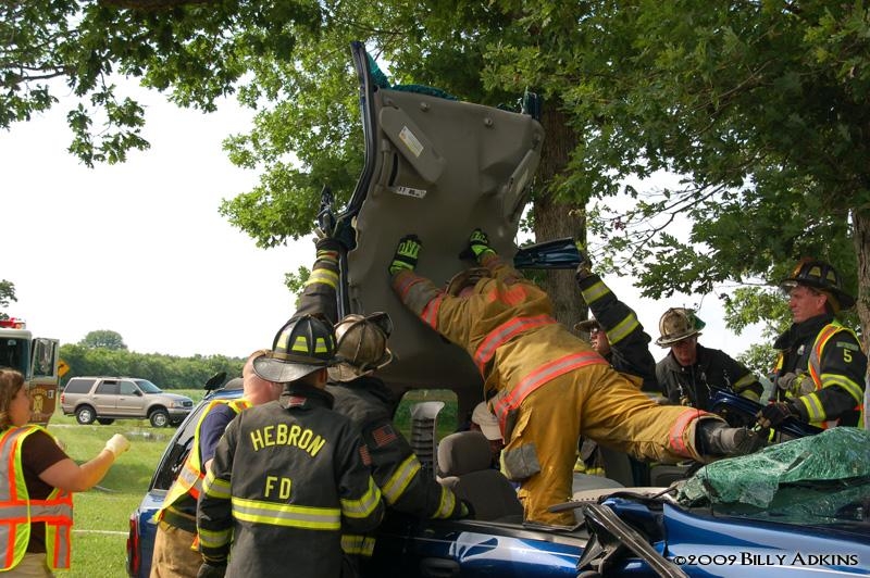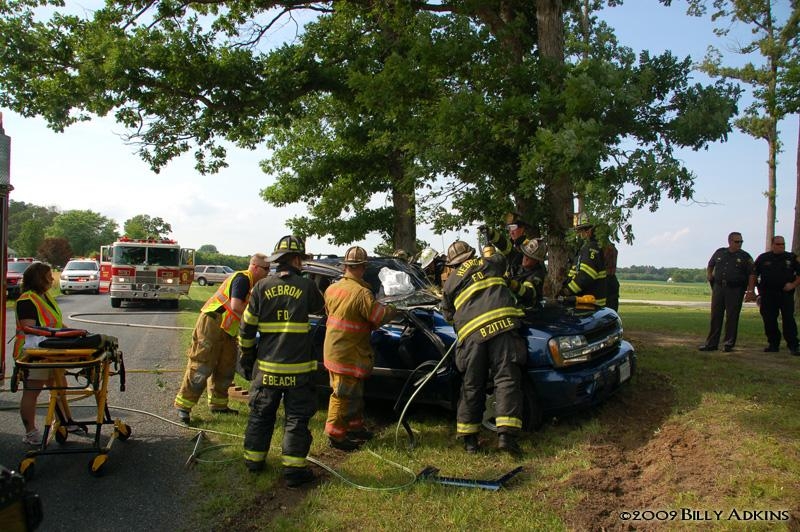 6/9/2009 – At 1624 hrs. Hebron VFD was alerted for single vehicle MVC with rescue N. West RD. Arriving units found single vehicle into a tree with confirmed entrapment.