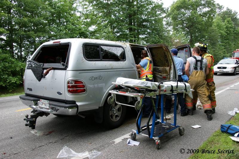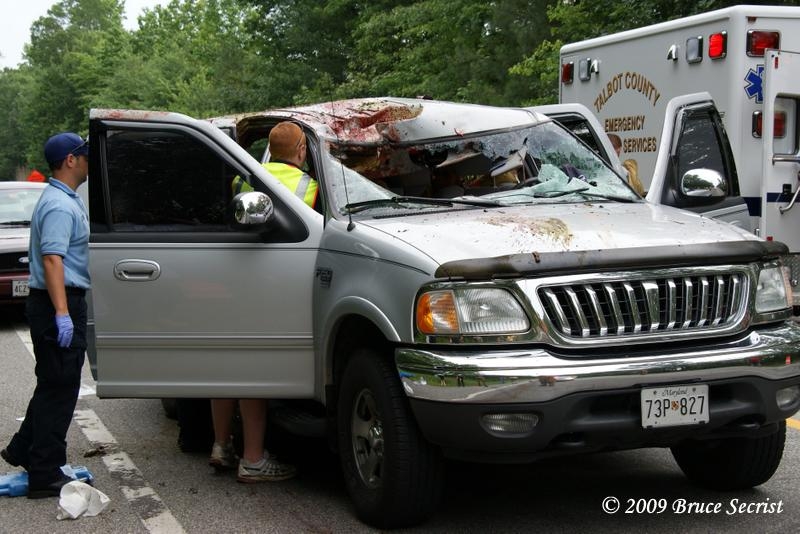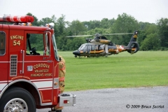 6/13/2009 – At 10:25 AM Talbot Center dispatched Station 50 (Cordova) and Paramedic 90 for a 10-50 PI on Three Bridge Branch Road in the area of Rabbit Hill Road. A short time later, all units were advised the actual location would be on Rt. 309 in the area of Three Bridge Branch Road. Engine 51 arrived on location to find one vehicle with severe damage caused by a deer. Command was established by Officer 503 (L. Larmore) and after patient evaluation, aviation was requested. Officer 502 (B.Messix) established the LZ in the parking lot of Station 50 and both patients were transported there by Paramedic 90 and Paramedic 96. One patient was transported to the University of Maryland Shock Trauma Center by Trooper 6 and the second patient was transported to Johns Hopkins by Trooper 4. All other patients refused treatment. The situation was placed under control at 11:45 AM.