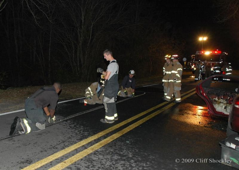 11/9/2009 – Around 6pm Wicomico Central alerted Station 74 to a reported car fire on Williams Mill Pond Rd. in Delmar. 74-15 arrived to find flames showing. Engine 74-3 arrived and quickly doused the fire with the front hand line. The car is believed to be a total loss.