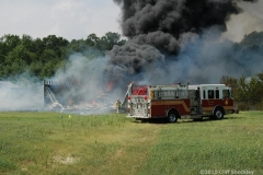 7/25/2010 – At 2:58pm Wicomico Central alerted Station 74 (Delmar), Station 14 (Sharptown) and Sussex Station 81 (Laurel) to a reported structure fire on White Deer Rd. northwest of Delmar. Sharptown crews could see a large column of heavy black smoke as soon as they pulled out of the firehouse and the call went out for additional tankers from Station 9 (Mardela Springs) and Station 5 (Hebron). They arrived to find a large farm equipment shed well involved and worked to contain the fire to the structure itself and not have it spread to the nearby woods. Temperatures were near 100 degrees at the time, and EMS crews from Delmar along with Sussex County EMS kept a close eye on personnel. Crews were provided water and sports drinks and cooled by hydrojet fans. It is believed at least one person was transported to PRMC. The structure was pulled apart and doused heavily with foam. The incident was cleared just in time for a thunderstorm approaching, about 2 hours after the initial alarm went out. Station 87 (Seaford) and Station 6 (Parsonsburg) provided standby crews. Please contact us with any additional information missed.