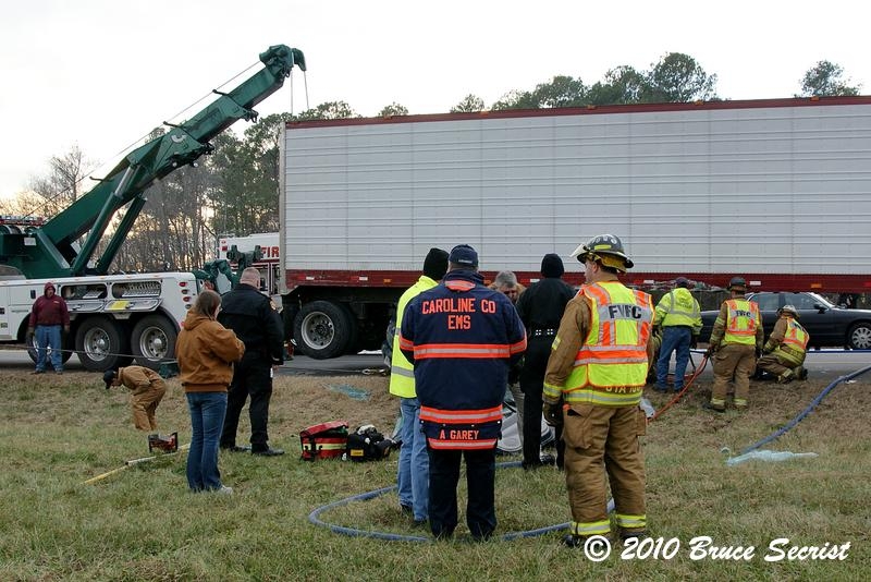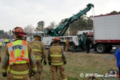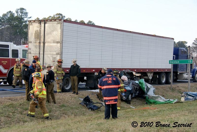 12/19/2010 – At approximately 1:50 PM Caroline dispatched Station 100 and Paramedic 11 for an MVC, tractor trailer vs. car with entrapment, at the intersection of Federalsburg Highway and Preston Road. Chief 1 (J. Thomas) arrived on location to find approximately half of the vehicle under the trailer and wedged in front of the axles. There was one patient with heavy entrapment. Chief 1 established “Federalsburg Highway” command and requested an additional Engine be dispatched from Station 200 (Preston).
