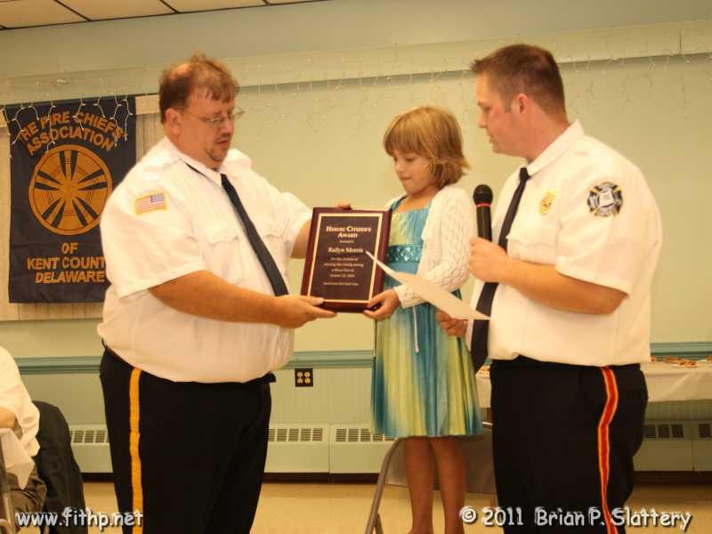 10/12/2011 – At their regular monthly meeting on Wednesday, October 12, 2011, the Kent County Volunteer Fire Chiefs Association presented their Heroic Citizen’s Award to seven year old Railyn Morris for her actions when a fire broke out in her family’s home last year.