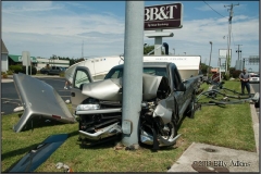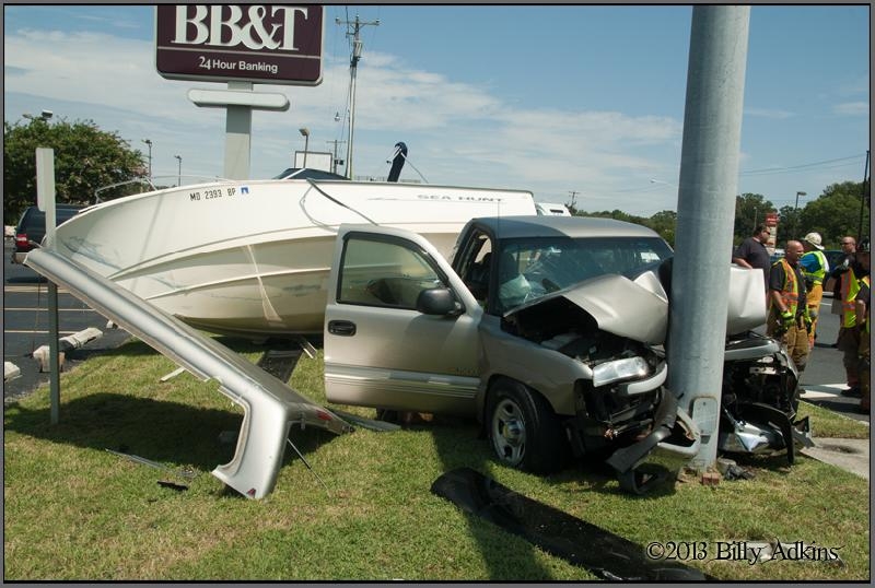 8/10/2013 – Around 12:30pm Wicomico Central alerted Salisbury Fire Dept. of a MVC with injuries, with entrapment, and possibly on fire on Rt 13 in the area of Center Road. Firefighters arrived on scene to find an pickup and boat/trailer off the roadway into a pole. The boat had come off the trailer and into the back of the truck destroying the cap on the truck. One patient was transported to PRMC. Two lanes were closed during the duration of the incident.